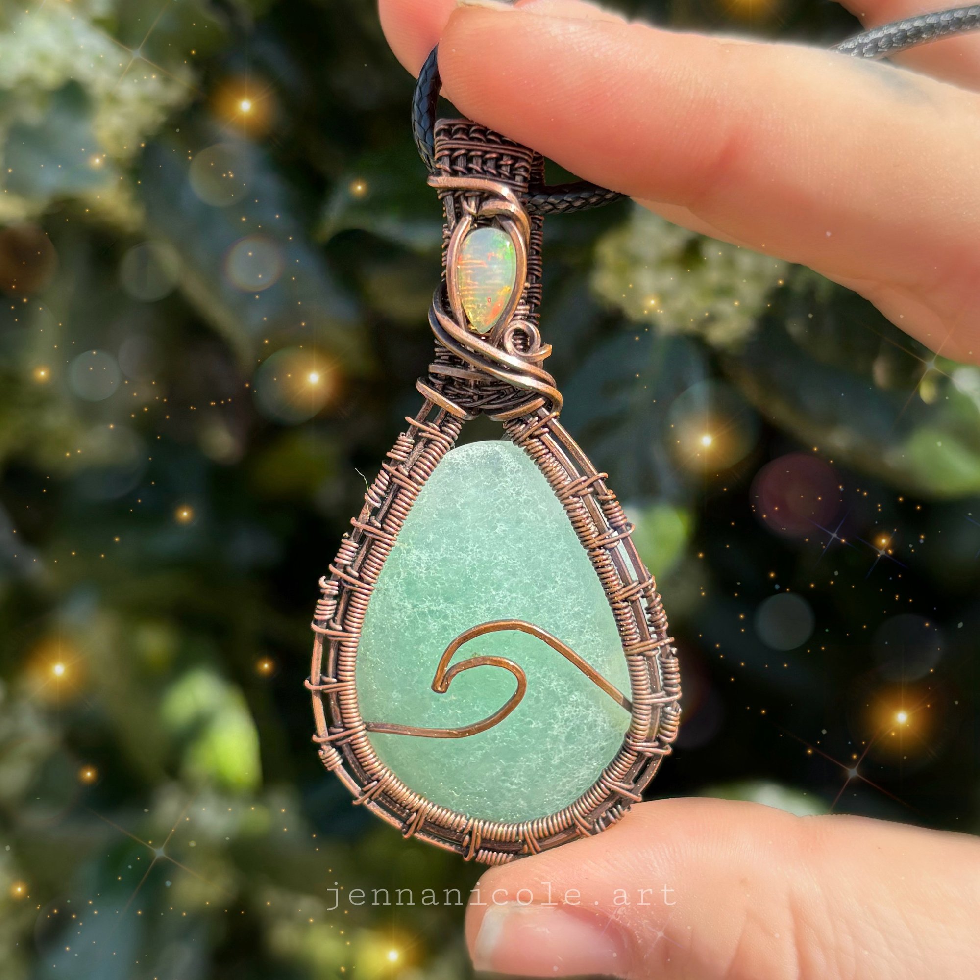 Aventurine wrapped in antiqued copper wire with an opal accent. All pendants come with a black cord necklace. Pendants pictured with copper chains come with a copper chain. Connected to all Chakras.