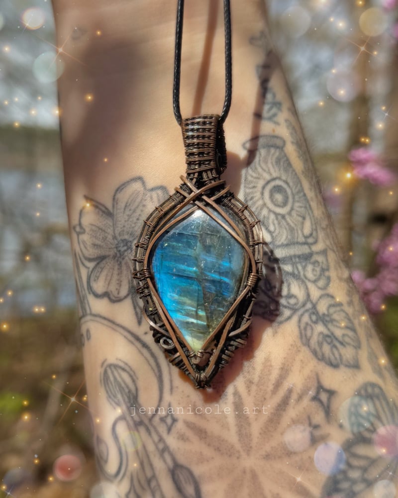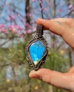 Azure Ocean Pendant is a one-of-a-kind piece, crafted slowly with intention. Bright, deep blue labradorite, wrapped in copper wire, reflects depth and clarity, chosen for its connection to the Throat and Third Eye Chakras.