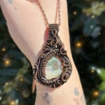 Ocean Jasper wrapped in antiqued copper wire and includes a copper chain necklace. All pendants come with a black cord necklace. Pendants pictured with copper chains come with a copper chain. Connected to Solar Plexus and Heart Chakra.